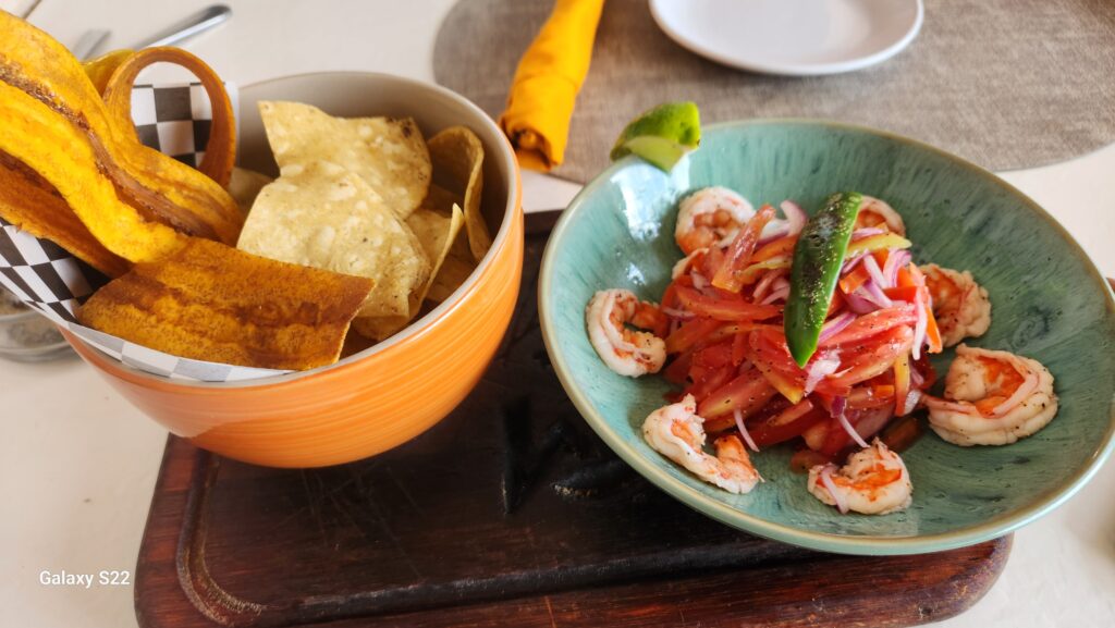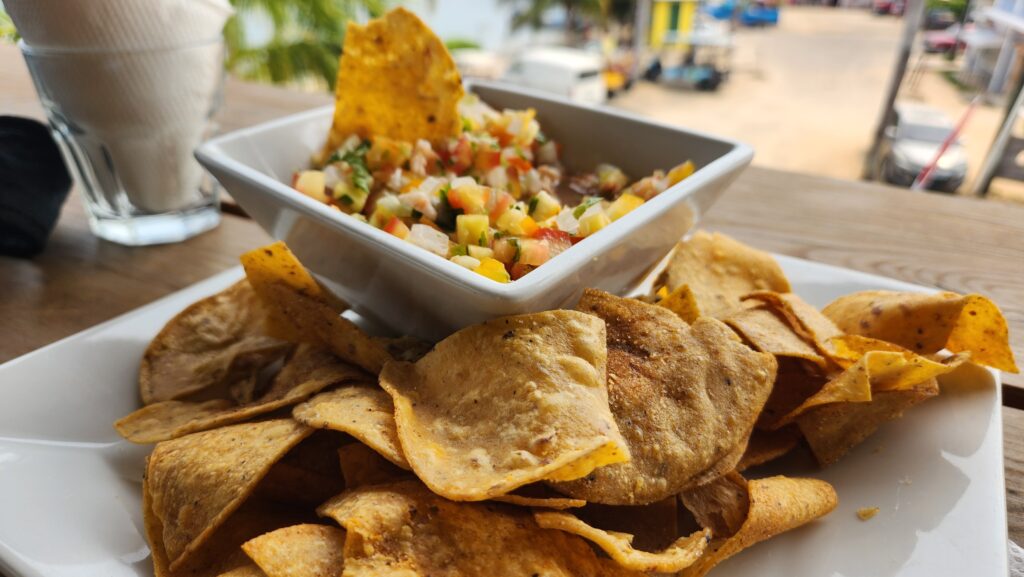 Mariposa Beach Resort is a bit north in Placencia, almost to the airport. It’s a nice setting with a pool overlooking the beach. I went there to try the ceviche on the recommendation of Chef Myra, and she was right, it was one of the best in Placencia! The presentation was unique with the whole shrimp and the julienne veggies. Extra points awarded for the plantain chips served along with the typical tortilla chips.