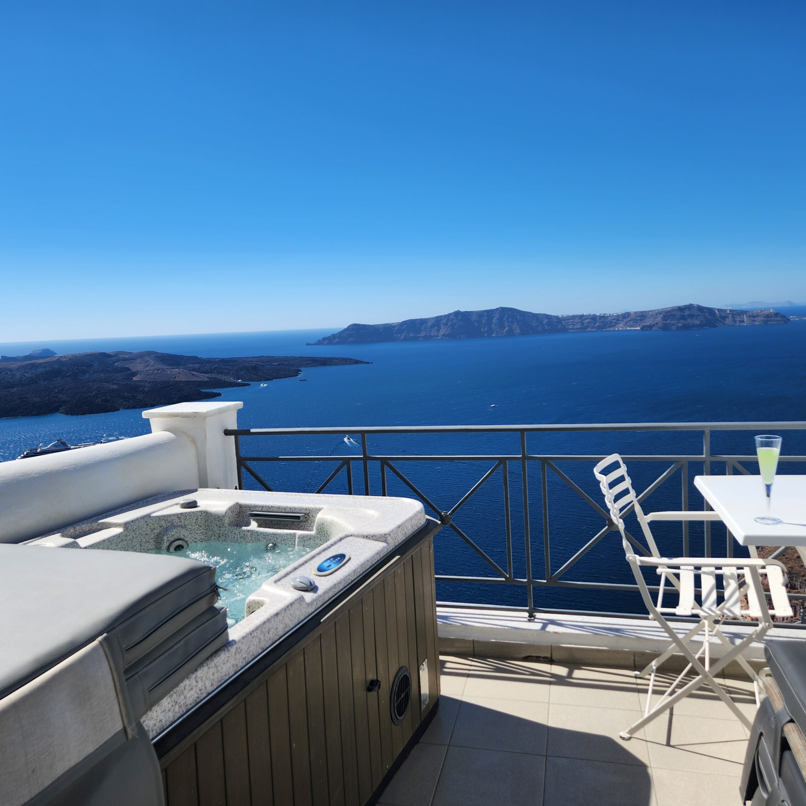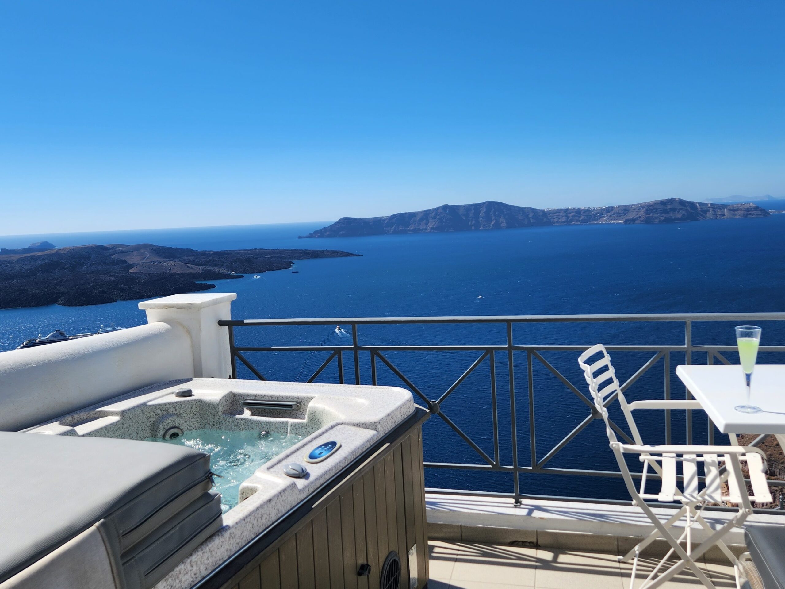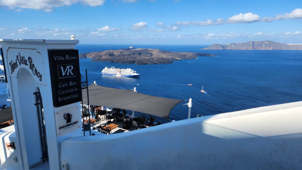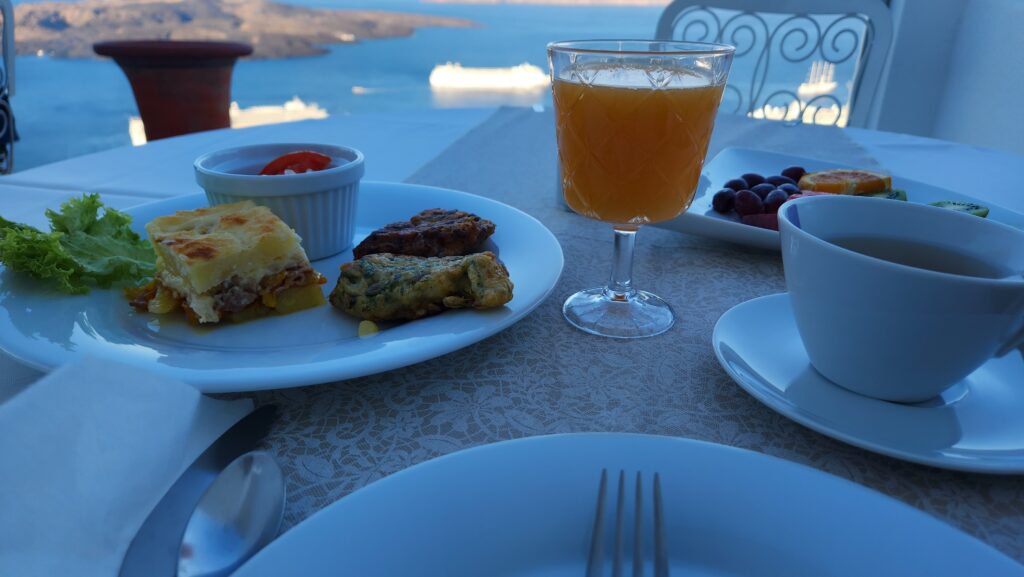 I recommend staying at one of the many local hotels and guesthouses that are cliffside on the western side of the island. For the price of some steep stairs, you’ll have a front row to one of the most stunning views in the world. It’s just below all the hustle and bustle, but relatively peaceful, while still convenient to everything. My favorite accommodation is Hotel Villa Renos. I’ve stayed there twice and it’s perfect. All rooms have a caldera view and many have private balconies with personal hot tubs. The included breakfast is completely unique–three small plate specials that could range from a carrot pie to a soup, to a spicy sausage. All home cooked and all delicious! Hotel Villa Renos is not my typical budget stay, but it is worth it!