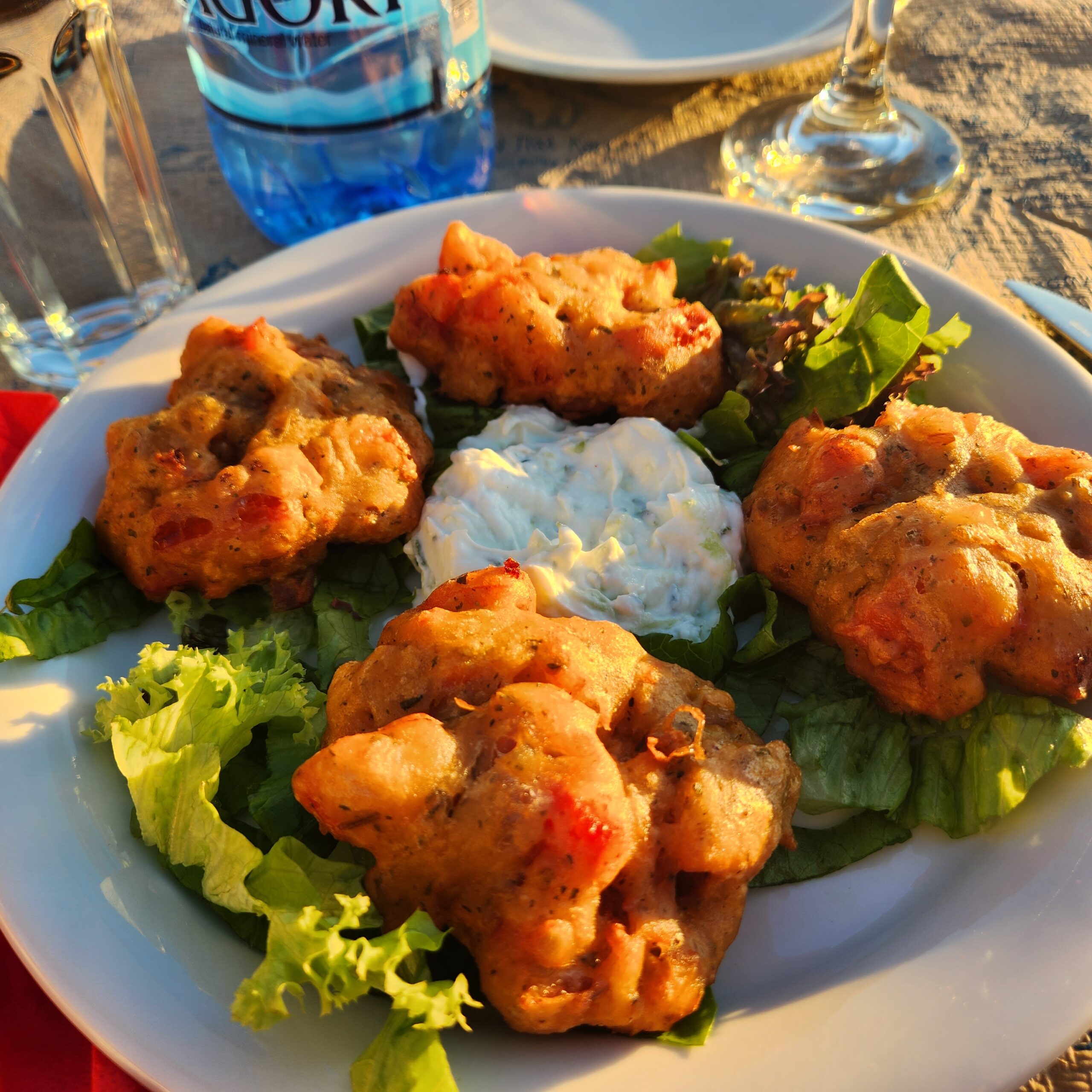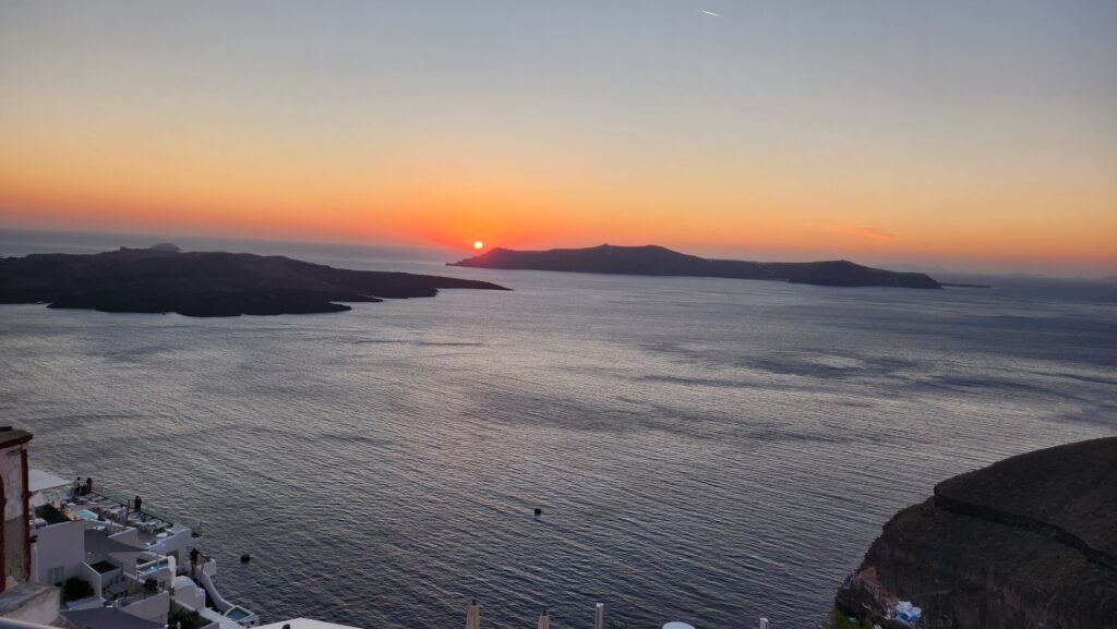 - Lombranos Taverna–This restaurant is at the old port, at the bottom of the cliff in Fira. Absolutely delicious tomato fritters and crispy grilled dorado, as well as a stunning sunset view. The old port is where many cruise ship passengers enter Santorini, so check the cruise ship schedule first. You can either walk down a LOT of steps or take the cable car. (Please do NOT choose a donkey ride as it’s an abusive practice.)