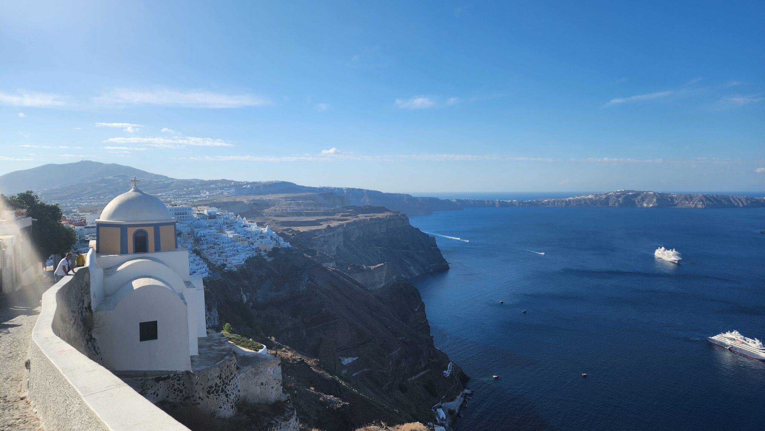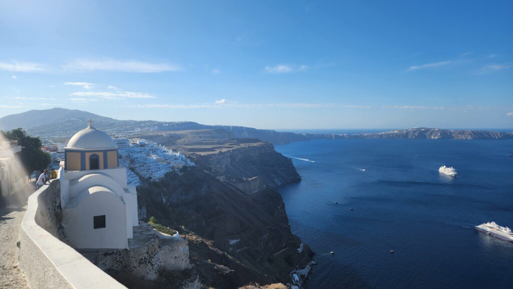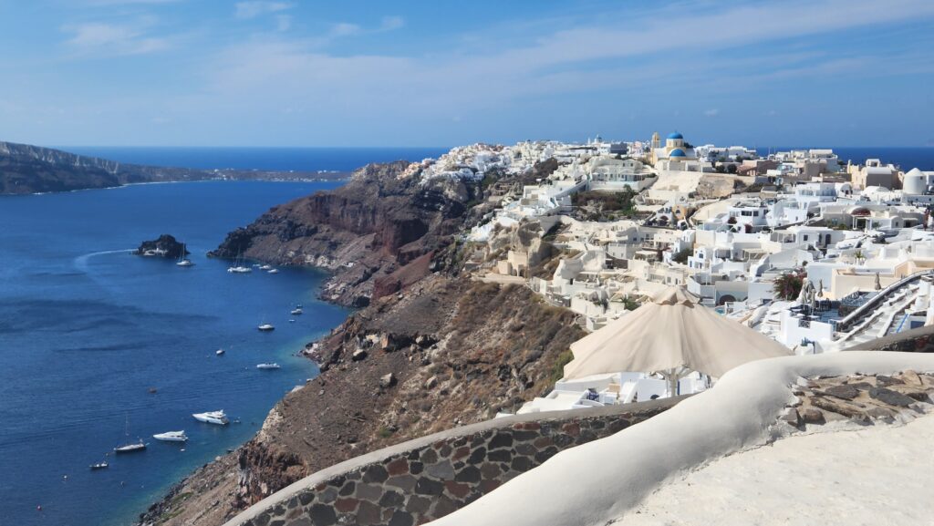 Oia is another popular town on the caldera side of Santorini. There is a cool 6.5 mile hike between Fira and Oia. The clifftop path takes you through some iconic views of towns, churches, and the beautiful, dark, Aegean Sea. It’s one of my very favorite things to do in Santorini! The hike is safe to do on your own. The path is clear and you can’t get lost as the sea is always to your left. It is a bit challenging, so make sure you have trainers or hiking shoes. (The proprietor at the Villa Renos hotel will check your feet and send you back to change if you try to leave his hotel to do this hike in flip flops!🙂)
