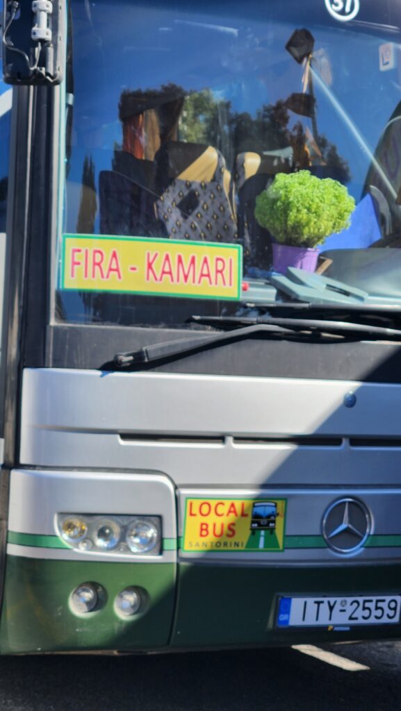 If you are a bit nervous about using public transport in foreign countries, Fira is a great place to start. The main bus station is is just a short walk from Hotel Villa Renos. Simply find your bus and get on once the doors open. Tell the driver where you are going and sit down. Someone will come around to collect the fare and they will answer any questions you have about where to get off. Santorini Public Buses site.